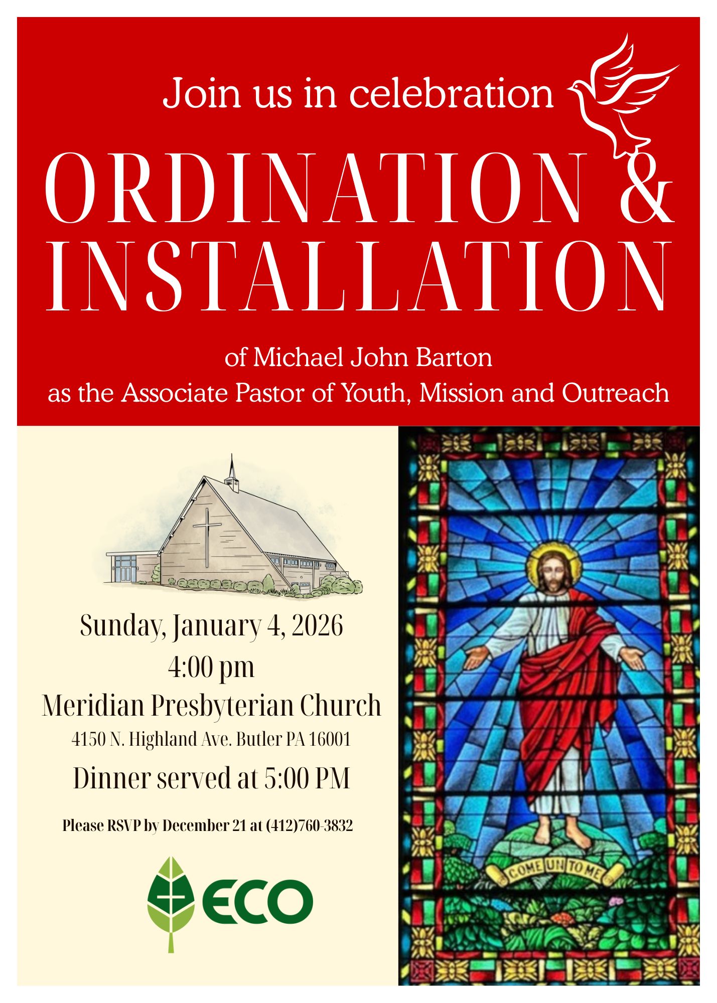 Come help us celebrate Pastor Mike’s ordination & installation with dinner served afterwards. Please sign up in the Fellowship Room if you would like to attend the dinner. Please reach out to Kala if you would like to help with the dinner.